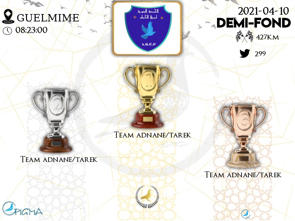 | 5 | TEAM ADNANE/TAREK | 2021-04-10 | 15:01:05 | 430.4304 | 1081.26 | 19-84916 | NO | 95.9184 | 1.6722 |
