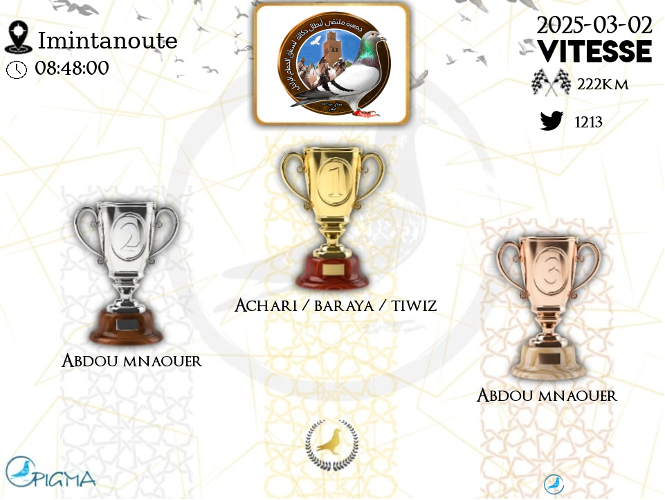 | 13 | BAYADIRA /EL HAMZAOUI / CHOAIB | 2025-03-02 | 11:26:08 | 222.1651 | 1404.924 | 24-20***11 | F | 96.0396 | 1.0717 |