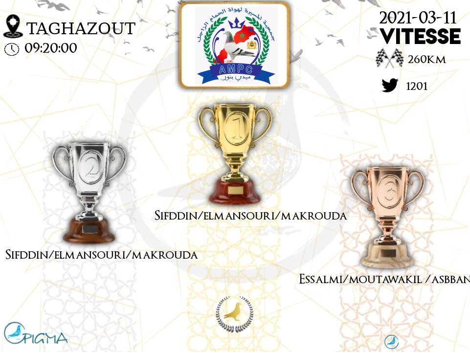 | 38 | TEAM HOUD / TOUFIQ | 2021-03-11 | 12:57:12 | 260.8764 | 1201.086 | 29259***19 | M | 87.6667 | 3.1640 |