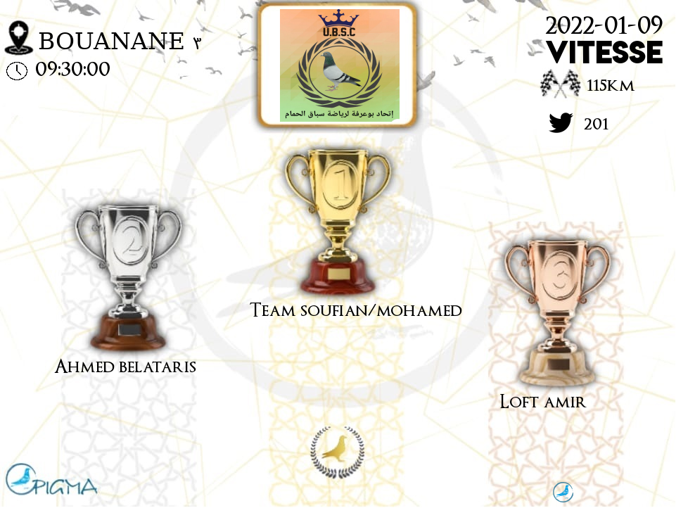 | 54 | TEAM SOUFIAN/MOHAMED | 2022-01-09 | 11:30:15 | 115.7144 | 962.28 | 21-43***44 | F | 73.6318 | 26.8657 |