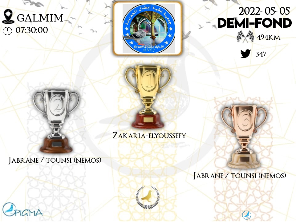 | 57 | JABRANE / TOUNSI (NEMOS) | 2022-05-05 | 17:06:32 | 494.3145 | 857.394 | 21-20***70 | F | 34.8837 | 16.4265 |
